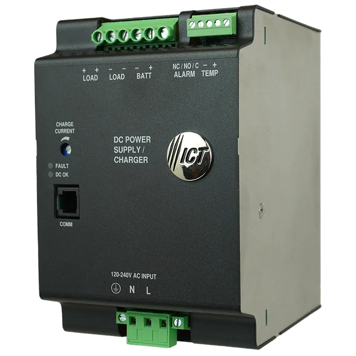 The ICT360 DIN Series is a compact, high-efficiency DIN-rail mounted DC power supply delivering 360W of regulated 24Vdc or 48Vdc output with integrated battery charging and Low Voltage Disconnect (LVD). It is designed for unattended and remote installations requiring dependable DC power with backup capability.